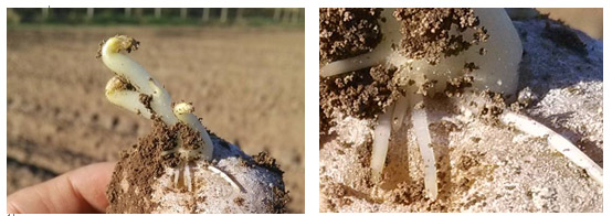 馬鈴薯植株生長及塊莖膨大需要從土壤中吸收大量的養(yǎng)分和水分,根系的發(fā)育情況與吸收能力就決定了馬鈴薯植株生長的健壯程度、塊莖的產(chǎn)量和品質(zhì)。馬鈴薯一般是先出芽,后長根,如果根系生長緩慢,會(huì)導(dǎo)致出芽生長不良,莖細(xì)瘦、抗病能力弱易感染黑痣病、黑脛病等土傳性病害。因此,促進(jìn)馬鈴薯根系發(fā)育,提高根系吸收能力是馬鈴薯優(yōu)質(zhì)高產(chǎn)的關(guān)鍵。