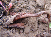 為根系真菌病害。從根部發(fā)病,初在皮層上出現(xiàn)黃褐塊斑,逐漸變黑,軟腐,向下擴(kuò)展到整個(gè)根系變黑腐爛,流出棕褐色汁液,有酒糟味,木質(zhì)部變?yōu)榈S色;后期病組織內(nèi)充滿白色菌絲;地上部癥狀葉片萎蔫死亡,嚴(yán)重時(shí)整株死亡。根腐病主要在高溫高濕季節(jié)發(fā)病,由病殘?bào)w傳播,接觸傳染。