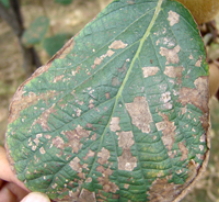 4月中旬,病原菌由葉背面開始侵染,為侵染的初期。5-6月份,氣溫20-24℃,更有利于侵染,此時(shí)期是侵染高峰期。7-8月為發(fā)病高峰期(此時(shí)期高溫高濕)葉部癥狀明顯,開始是小病斑,后逐步擴(kuò)大,葉片后期干枯,大量落葉。到8月下旬開始大量落果。