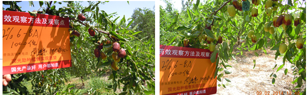 2014年7月,新疆吐魯番伊拉湖鮑秀,在灰棗幼果期噴施國光植生源1000倍+國光優(yōu)豐1500倍,使用1次,成熟期觀察,使用保果膨果套餐灰棗,保果效果好,棗果膨大明顯,且不影響上色成熟,畸形果率少;對(duì)產(chǎn)量進(jìn)行測(cè)定,使用保果套餐灰棗增產(chǎn)12%。