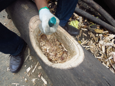 1、在樹干上用銼刀挖出一個樹洞,將樹洞邊緣及底部修整平(圖1);