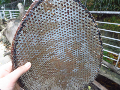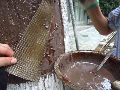 4、用剪刀剪下一塊與樹洞洞口大小一致的鐵皮(圖4)及制作好的仿真樹皮,將國光仿真樹皮專用膠及顏料調勻,涂抹在仿真樹皮背面后,將仿真樹皮粘貼在剪好的鐵皮上(圖5);