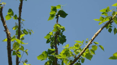 刺桐姬小蜂專一危害刺桐屬植物,該蟲生殖能力很強(qiáng),通常一旦出現(xiàn)輕微感染,短時間內(nèi)便會擴(kuò)散到全株。刺桐姬小蜂將卵產(chǎn)于刺桐嫩葉和葉柄組織內(nèi), 幼蟲在植物組織內(nèi)生長發(fā)育。由于植物組織受到幼蟲唾液分泌物刺激而增生, 呈水泡狀膨大, 并在葉片背面和葉柄上形成瘤狀蟲癭。蟲癭很快蔓延到全株, 致使全株葉片組織膨大,發(fā)展形成畸形、卷曲的病葉,嚴(yán)重影響整體景觀效映。幼蟲在蟲癭內(nèi)化蛹, 羽化的成蟲從蟲癭的羽化孔飛出。姬小蜂除了造成蟲癭, 使枝葉膨大、扭曲變形, 降低刺桐的觀賞價值外, 還會使形成蟲癭的枝、葉和旁邊的嫩枝、嫩芽枯死,葉片脫落。新發(fā)的葉片、嫩枝不斷受到感染, 無法長出健康的枝葉進(jìn)行光合作用,到后期直接造成刺桐樹死亡。