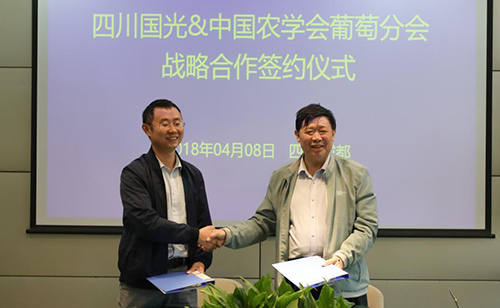 2018年4月8日,中國(guó)農(nóng)學(xué)會(huì)葡萄分會(huì)會(huì)長(zhǎng)劉俊、秘書長(zhǎng)張鶴蒞臨國(guó)光,與國(guó)光總經(jīng)理顏亞奇就葡萄產(chǎn)業(yè)現(xiàn)狀與種植技術(shù)變革進(jìn)行了交流,雙方在友好協(xié)商、互相促進(jìn)的前提下簽署了戰(zhàn)略合作協(xié)議,國(guó)光有幸成為了中國(guó)農(nóng)學(xué)會(huì)葡萄分會(huì)第一家戰(zhàn)略合作單位。