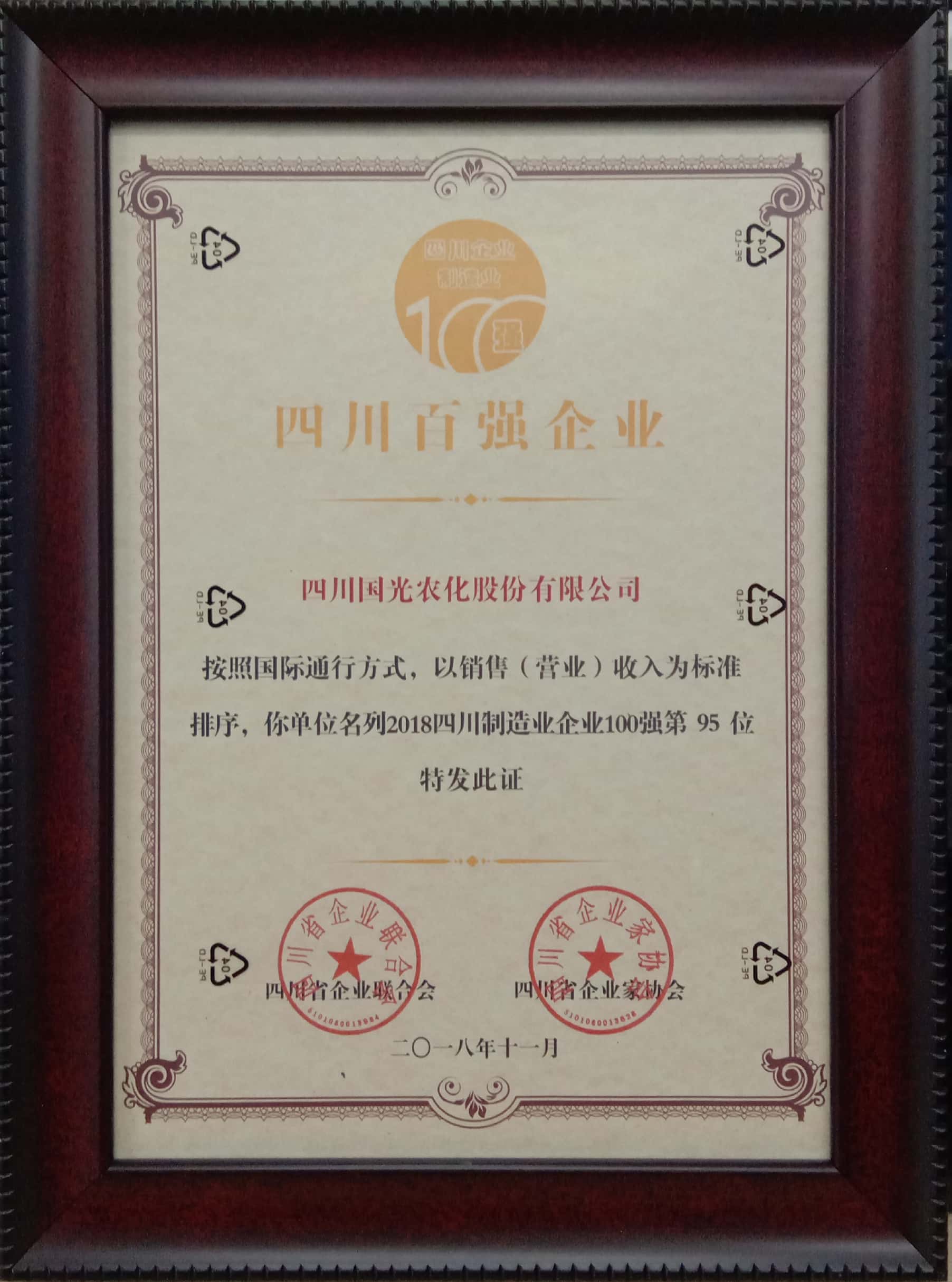 在這次評(píng)選活動(dòng)中,國(guó)光股份榮獲“2018四川省制造業(yè)百?gòu)?qiáng)企業(yè)”榮譽(yù)稱號(hào)。